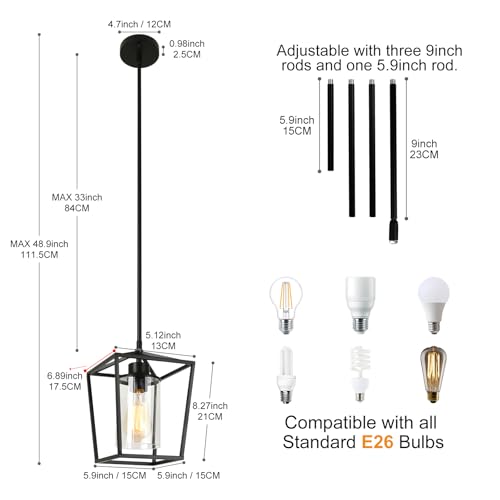 This pendant light measures 5.9 x 5.9 x 8.27 inches and includes adjustable rods for customizing the hanging height. Designed for versatility, it accommodates all standard E26 base bulbs, offering both dimmable and energy-efficient lighting options for your home.