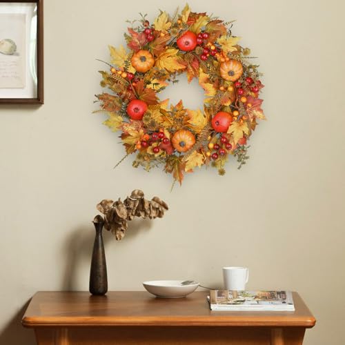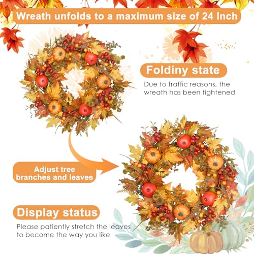 Our fall wreath showcases a blend of maple leaves, oak leaves, pumpkins, and berries, all carefully arranged to create a lush and inviting look. The 24-inch size ensures a bold statement, while the handcrafted quality guarantees durability season after season.