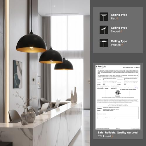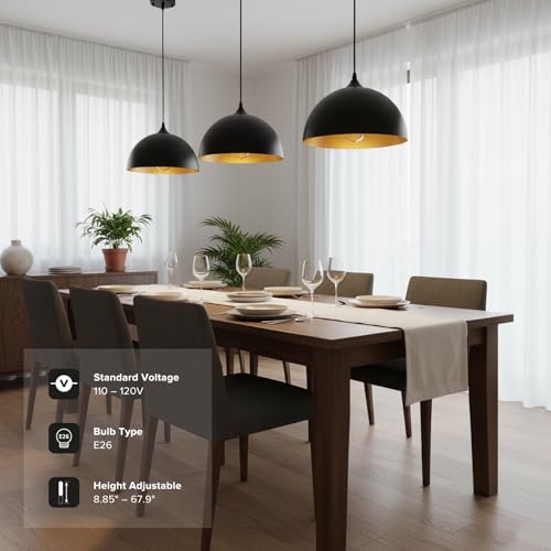 Our 3 Pack Black Pendant Lights are designed to bring a touch of modern elegance to your home. Featuring a chic matte black dome paired with a warm gold interior, these lights create an inviting ambiance, perfect for any kitchen island, dining room, or living area. The striking contrast and sleek design make them an ideal choice for those who appreciate a blend of modern and vintage style.