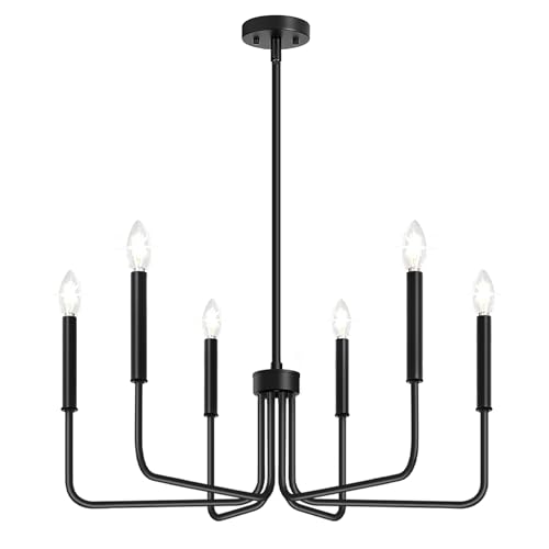 Transform your living space with the sophisticated allure of this black chandelier. Designed with a perfect blend of rustic farmhouse charm and industrial modern style, it features six elegantly curving lamp arms that create a captivating ambiance. With its solid structure and matte black finish, this chandelier is poised to be the centerpiece of any room.