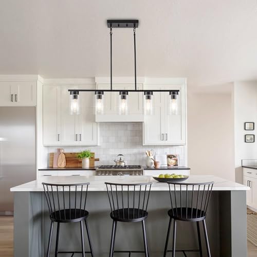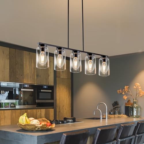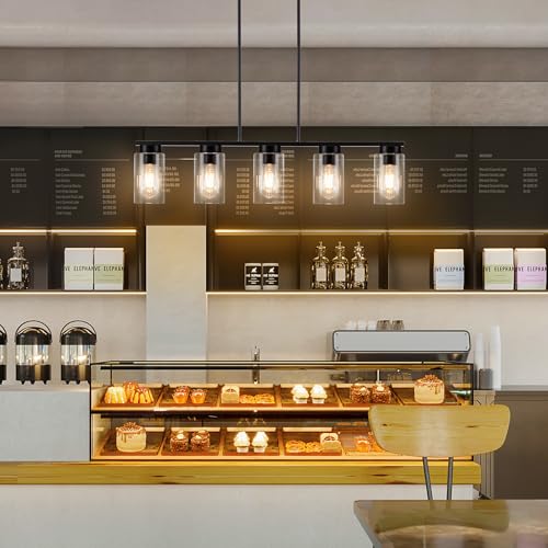 Constructed from high-quality black metal and clear glass, the chandelier’s five lights offer brilliant illumination. The adjustable height ensures it fits seamlessly in various spaces, from dining rooms to cafes. Its industrial farmhouse design suits both modern and traditional interiors.