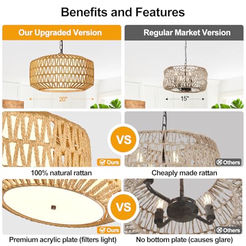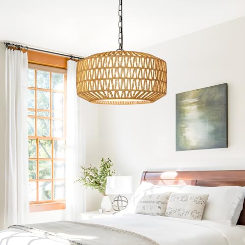 Crafted by skilled artisans, the chandelier features a durable metal frame and a hand-woven abaca rattan shade. The 20-inch diameter ensures ample light diffusion, while the adjustable height makes it suitable for various ceiling types, including high sloped ceilings.