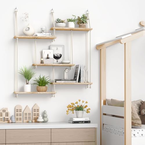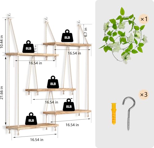 Discover the beauty and functionality of the FKSLIFE Hanging Shelves for Wall. This macrame hanging plant shelf, complete with enchanting vine lights, is designed to enhance your home with a charming boho aesthetic. Its 5-tier rope floating shelf is a perfect blend of rustic elegance and modern functionality.