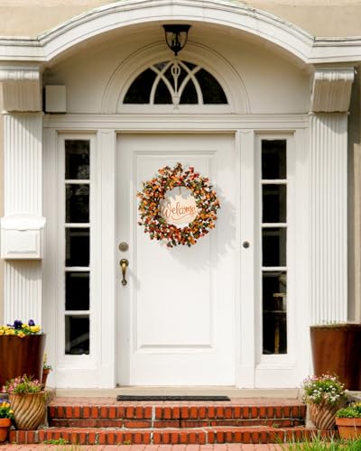 Embrace autumn’s charm with Taybonds Fall Wreath, featuring vibrant leaves, mini pumpkin berries, and a rustic wooden welcome sign. Perfect for a cozy, inviting front door display.