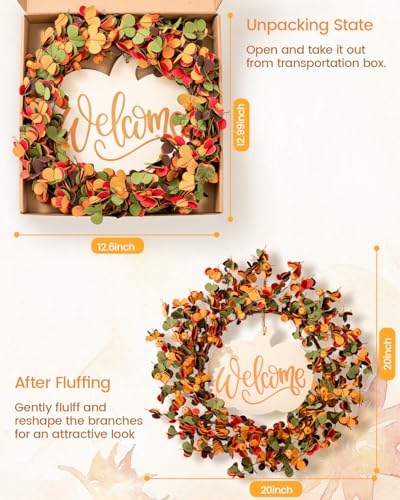 Designed with quality craftsmanship, this autumn wreath boasts lifelike leaves in shades of orange, red, and green, accented by miniature pumpkin berries. The durable, weather-resistant materials ensure longevity, while the rustic wooden sign adds a touch of vintage charm.