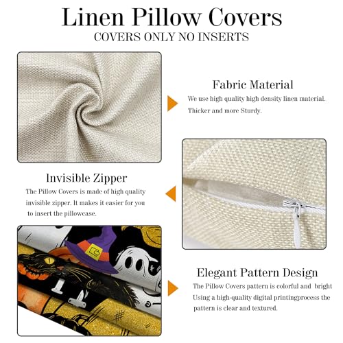 Each pillow cover is crafted from high-quality linen, ensuring durability and a luxurious feel. The 18×18 inch covers are designed with a hidden zipper for a seamless look and easy pillow insertions. The striking black, orange, and white color palette is perfect for adding a pop of Halloween charm to any space.