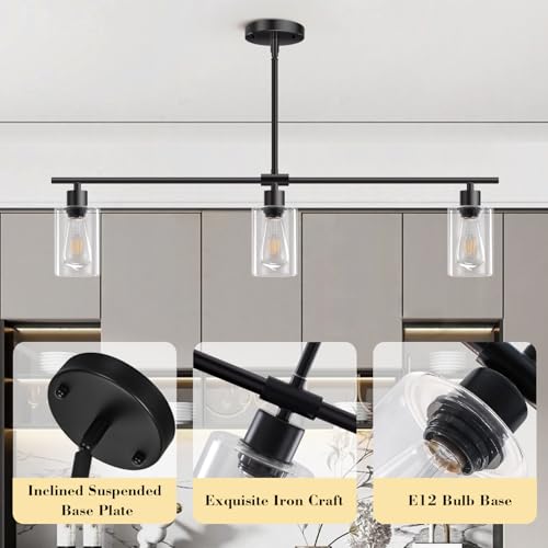 Transform your dining room or kitchen with the Yarlkav Kitchen Island Lighting. Designed with a modern farmhouse aesthetic, this three-light linear chandelier offers a blend of rustic charm and contemporary style. Its sleek black finish and clear glass shades provide a warm, inviting ambiance perfect for any home.