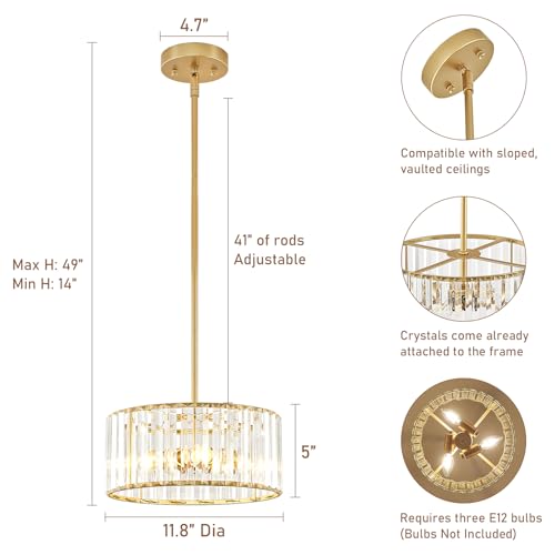 The chandelier measures 11.8 inches wide and is expertly crafted with a sleek metal frame adorned with K9 crystals. Its open-bottom design ensures bright, even lighting, and the height can be adjusted from 14 to 49 inches for versatile installation. Compatible with flat, sloped, and vaulted ceilings, it’s perfect for any room layout.